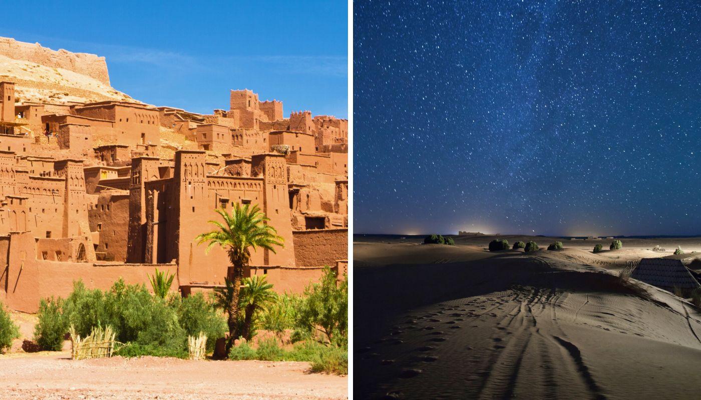 Los recorridos que parten desde Merzouga sirven para adentrarse en las suaves dunas de Erg Chebbi, espectaculares en cualquier momento del día aunque aún más al amanecer. Durante la excursión habrá actividades para todos los gustos: desde paseos en camello por el desierto hasta danzas tradicionales de las etnias que habitan este territorio. Lo más especial vendrá al final del día, con una cena bajo la luz de las estrellas que, en esta parte del mundo, brillan más de lo normal. En este tipo de recorridos se suele dormir en jaimas, alojamientos típicos de la comunidad bereber.